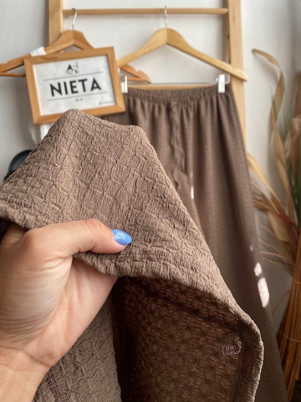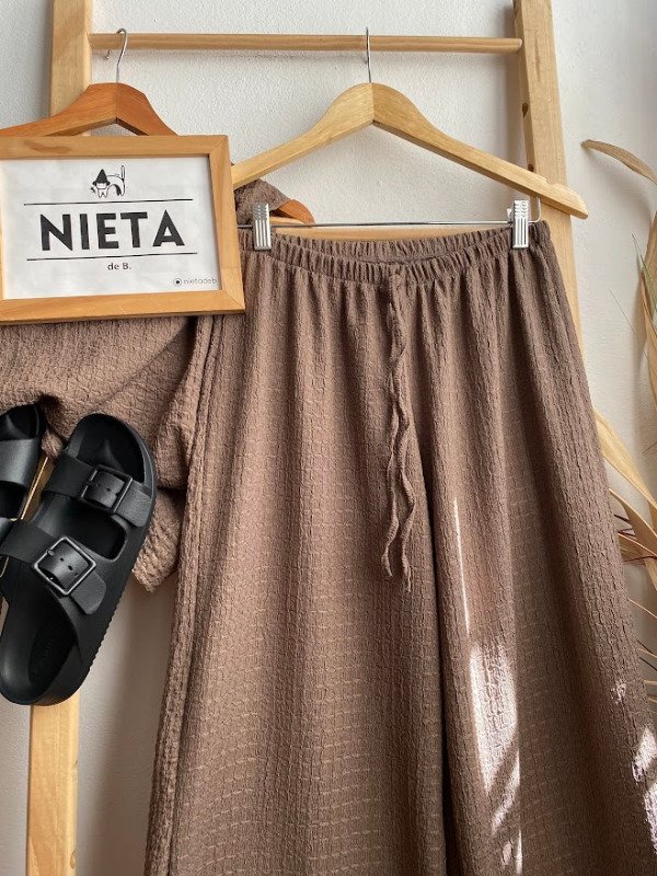 Pantalón pijamero en tela tramada elastizada, cintura elastizada con cordón.