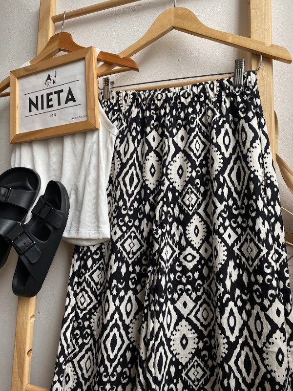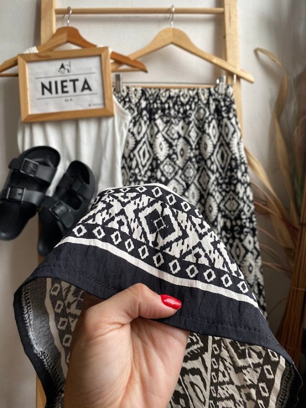 Pantalón pijamero en tela estampada con bolsillos laterales escondidos y cintura elastizada.