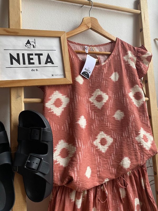 Blusa en tela estampada, corte recto, escote redondo, sin mangas, finalizadas en volados.