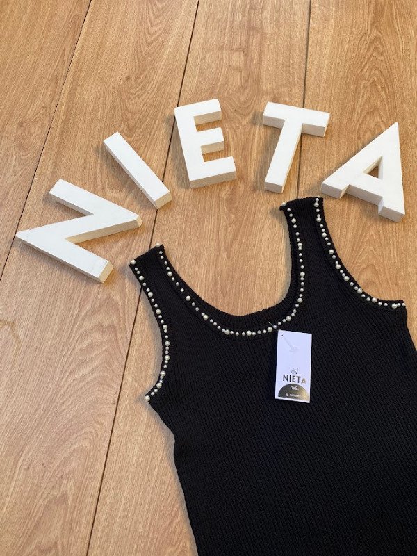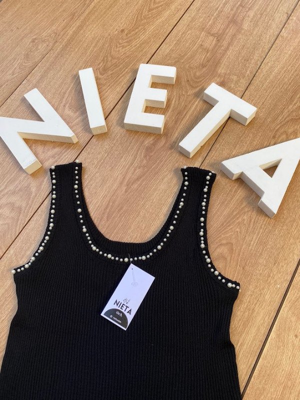 Musculosa de hilo morley con corte clásico. Escote y sisas con detalle en perlas.