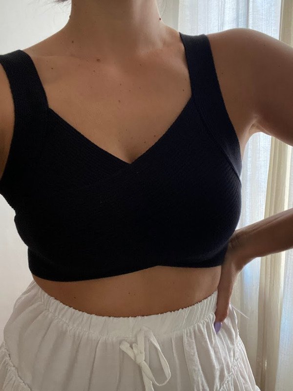 Top en hilo de lycra. Frente cruzado, espalda recta, breteles anchos.