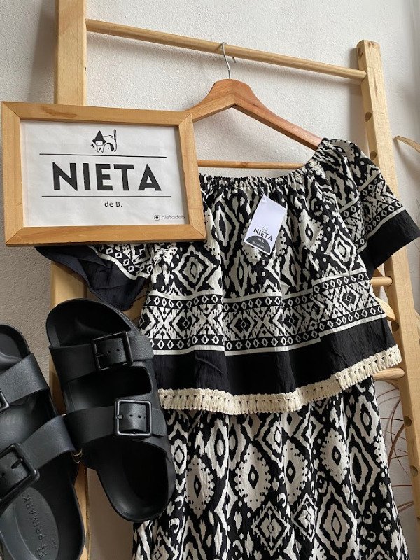Top en tela estampada, manga corta, corte paisana, detalles de flecos en hilo.