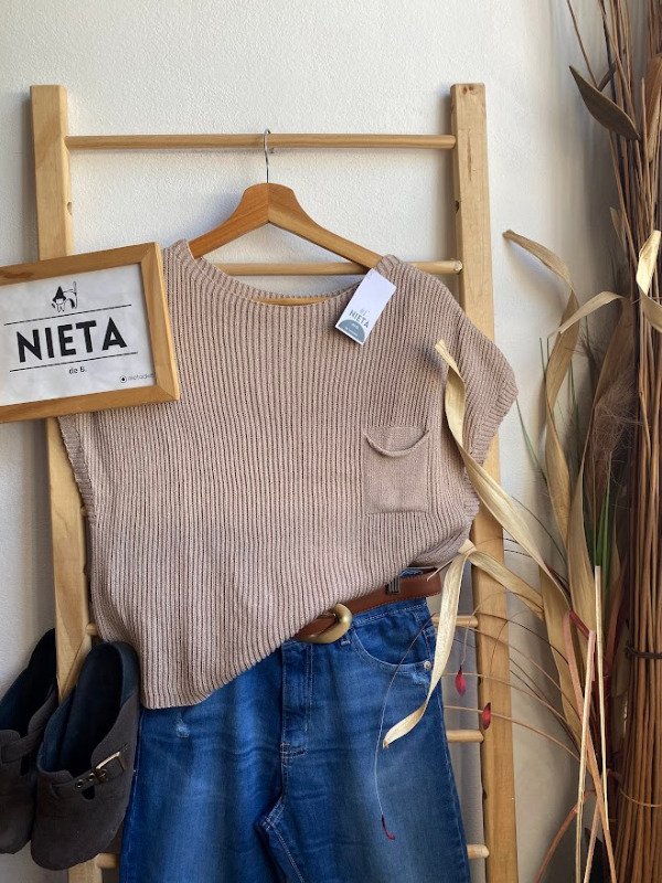 Chaleco de hilo de lycra con cuello bote, corte recto y mangas caídas. Detalle de pequeño bolsillo