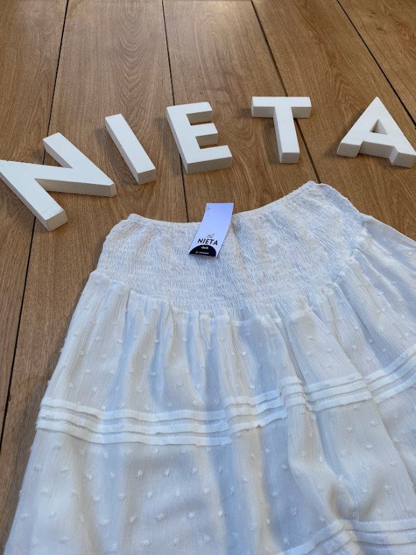 Pollera confeccionada en plumetí con cintura ancha en nido de abeja y alforzas intercaladas