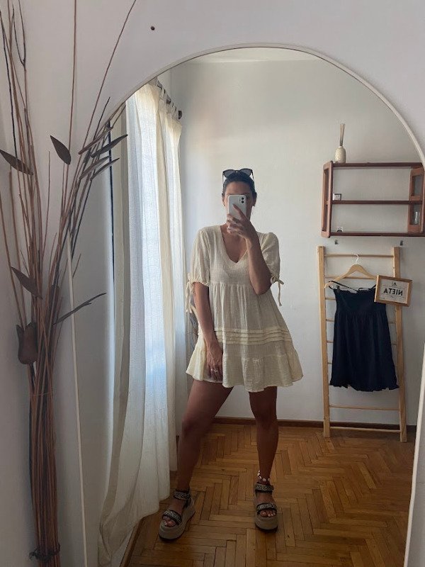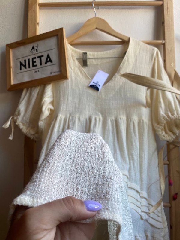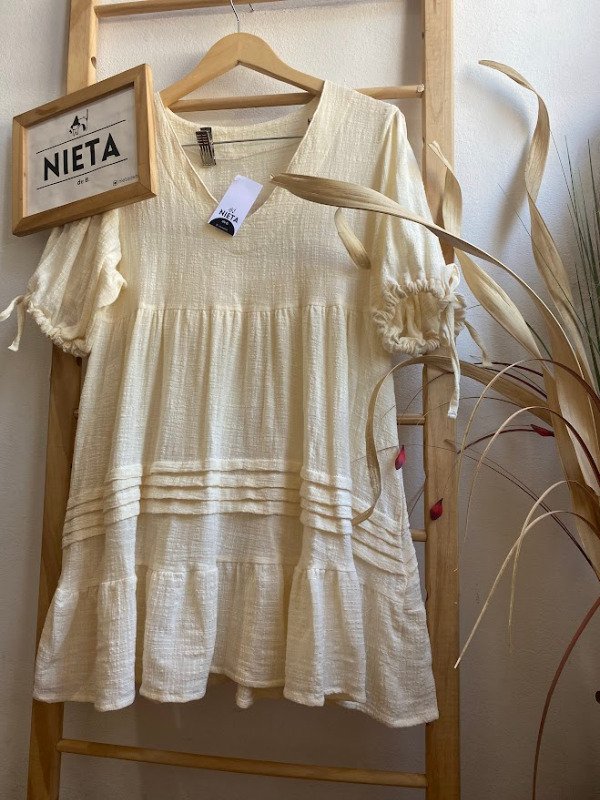 Vestido de lino cotton con escote en V. Manga corta abullonada acabada con lazo para regular. Detalle de bajo con alforzas, terminado en volados.
