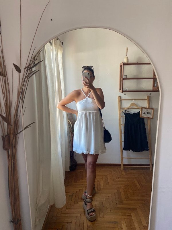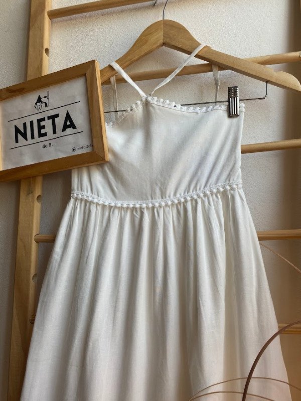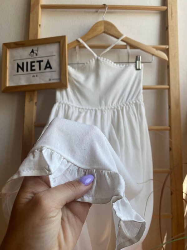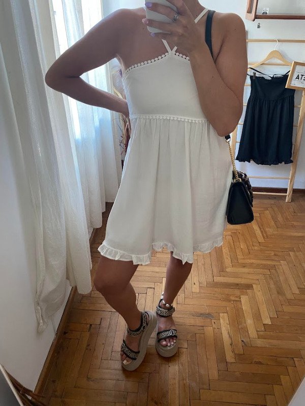 Vestido corto de algodón con detalles en busto en sutiles puntillas. Breteles finos en V y espalda con frunces. Bajo acabado en volado. Forrería a tono.
